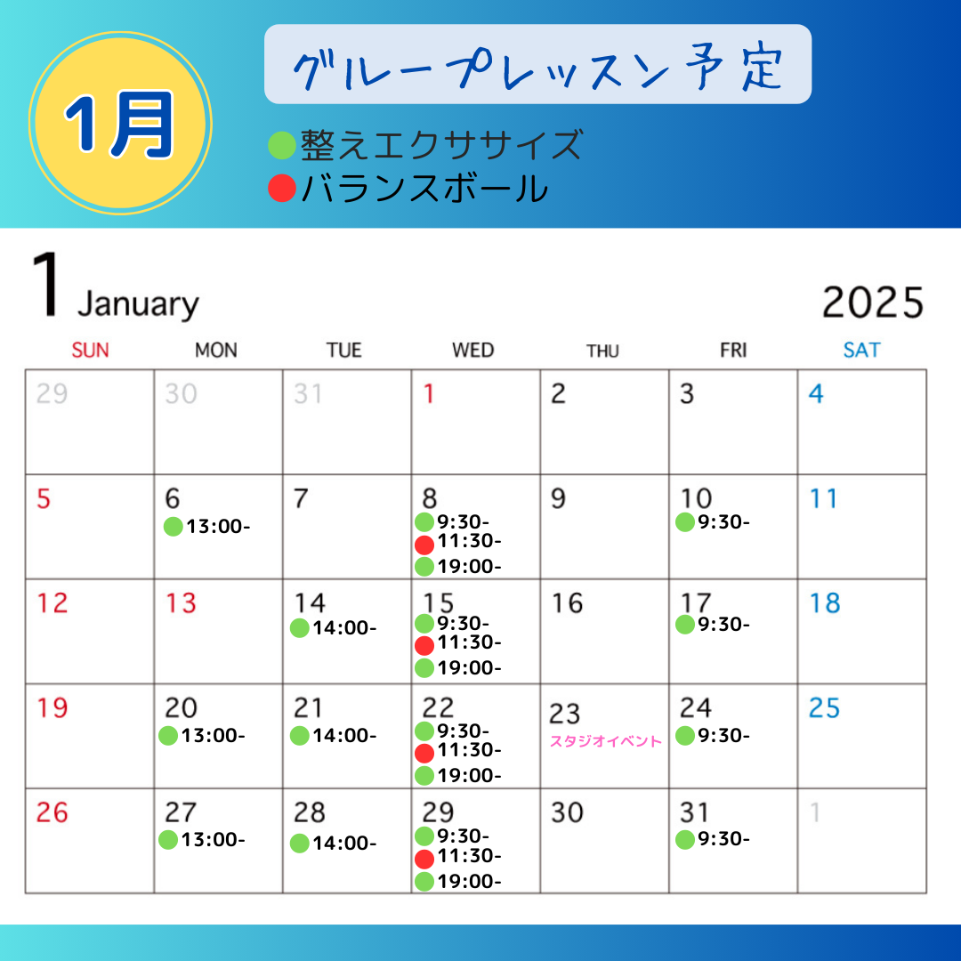 1月のグループレッスン予定 2024.12.18 1月のグループレッスン予定 1月のグループレッスン予定を公開しました。 西所沢のFluoriteスタジオでの開催です。 満席のなる日も増えています。 早めのお申し込みをお願いします。