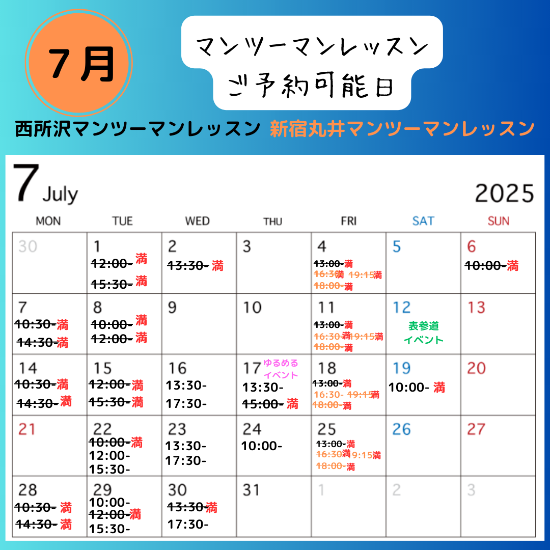 7月のマンツーマンレッスンの予定